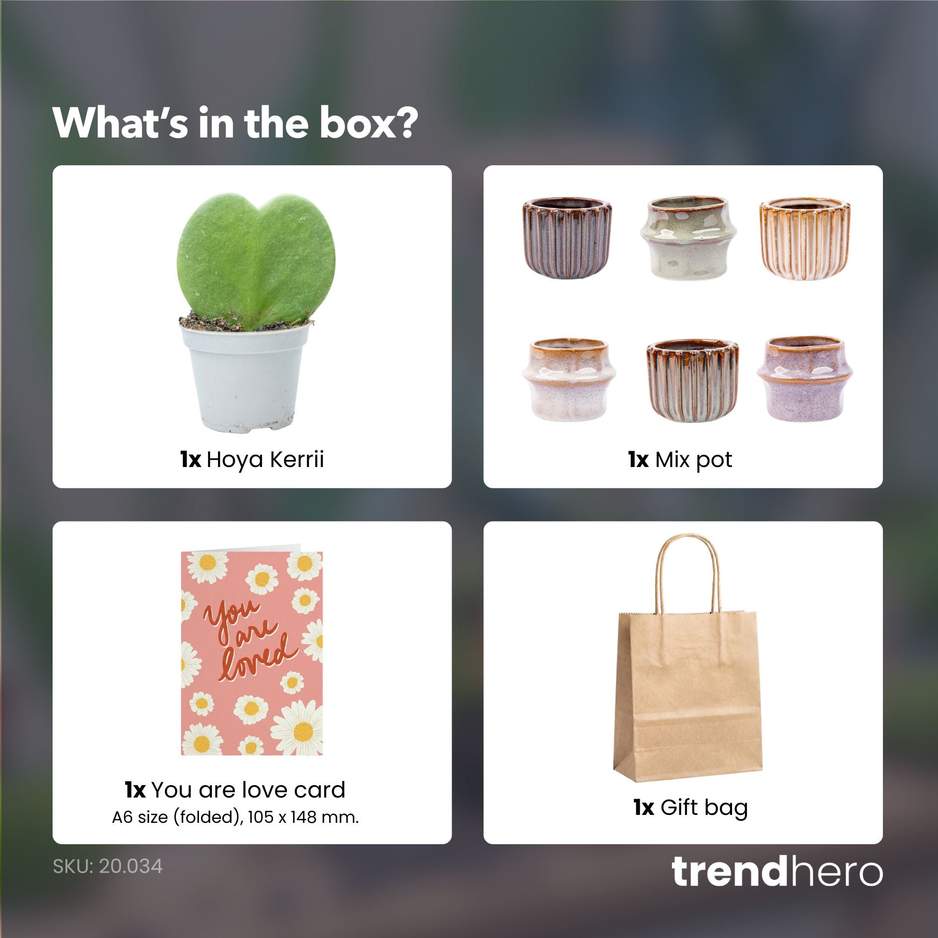Maak je bestelling extra bijzonder met deze mini-cadeauset. Een eenvoudige en attente manier om van elk product een persoonlijk cadeau te maken, of het nu gaat om een terrarium, plant of woonaccessoire. Deze set bevat een hartvormige Hoya kerrii in een sierpot, een persoonlijke kaart en een tasje van natuurlijk kraftpapier dat je zelf kunt personaliseren. De pot wordt gekozen uit onze Barcelona- of Madrid-collectie, wat elke set uniek maakt.